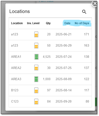 - Inventory Lookup – Users can quickly view all locations that contain a part, along with the transaction date and the inventory’s age.